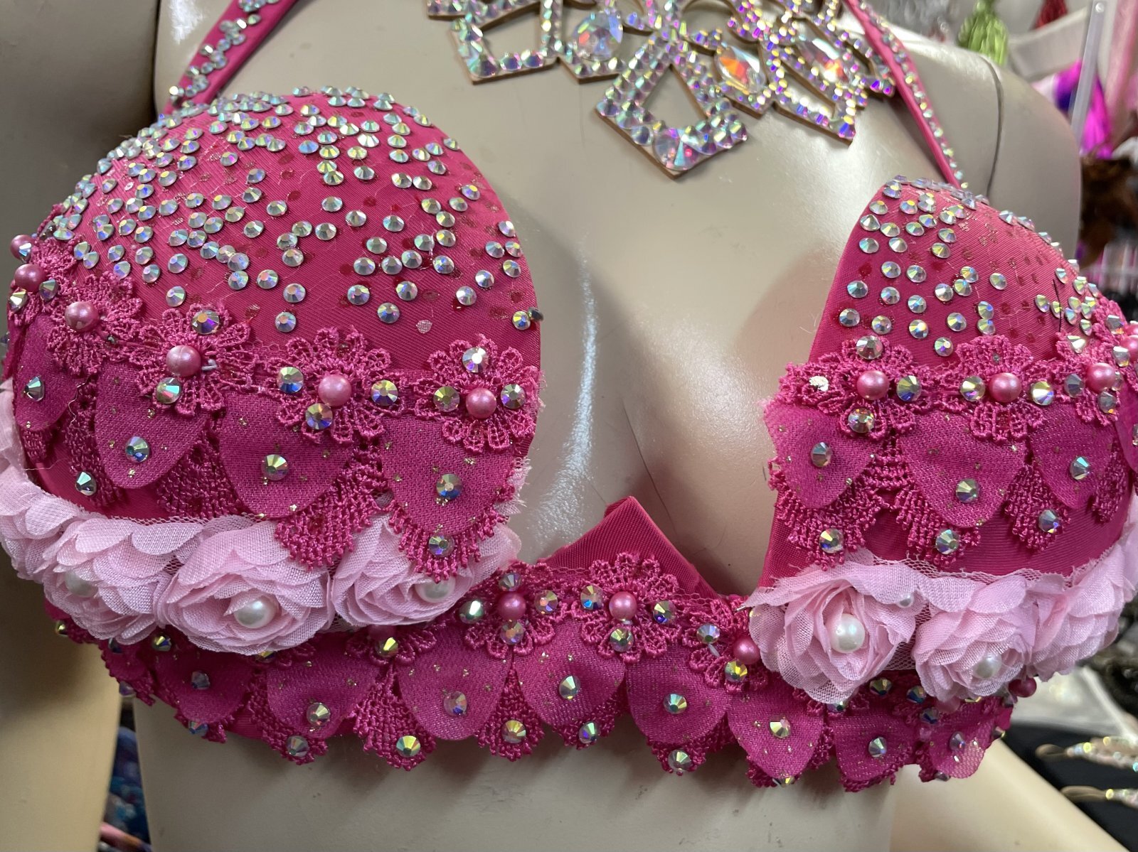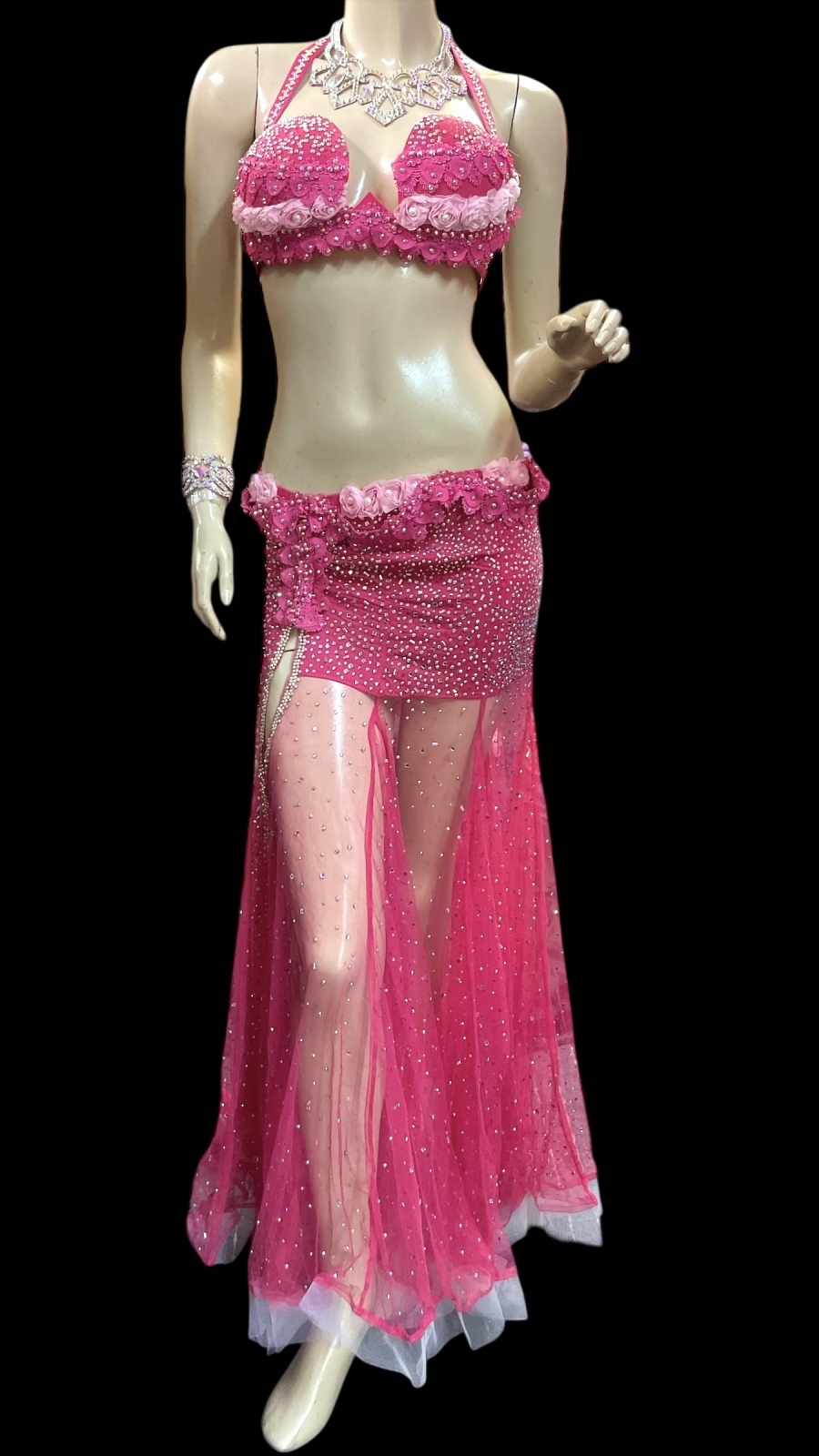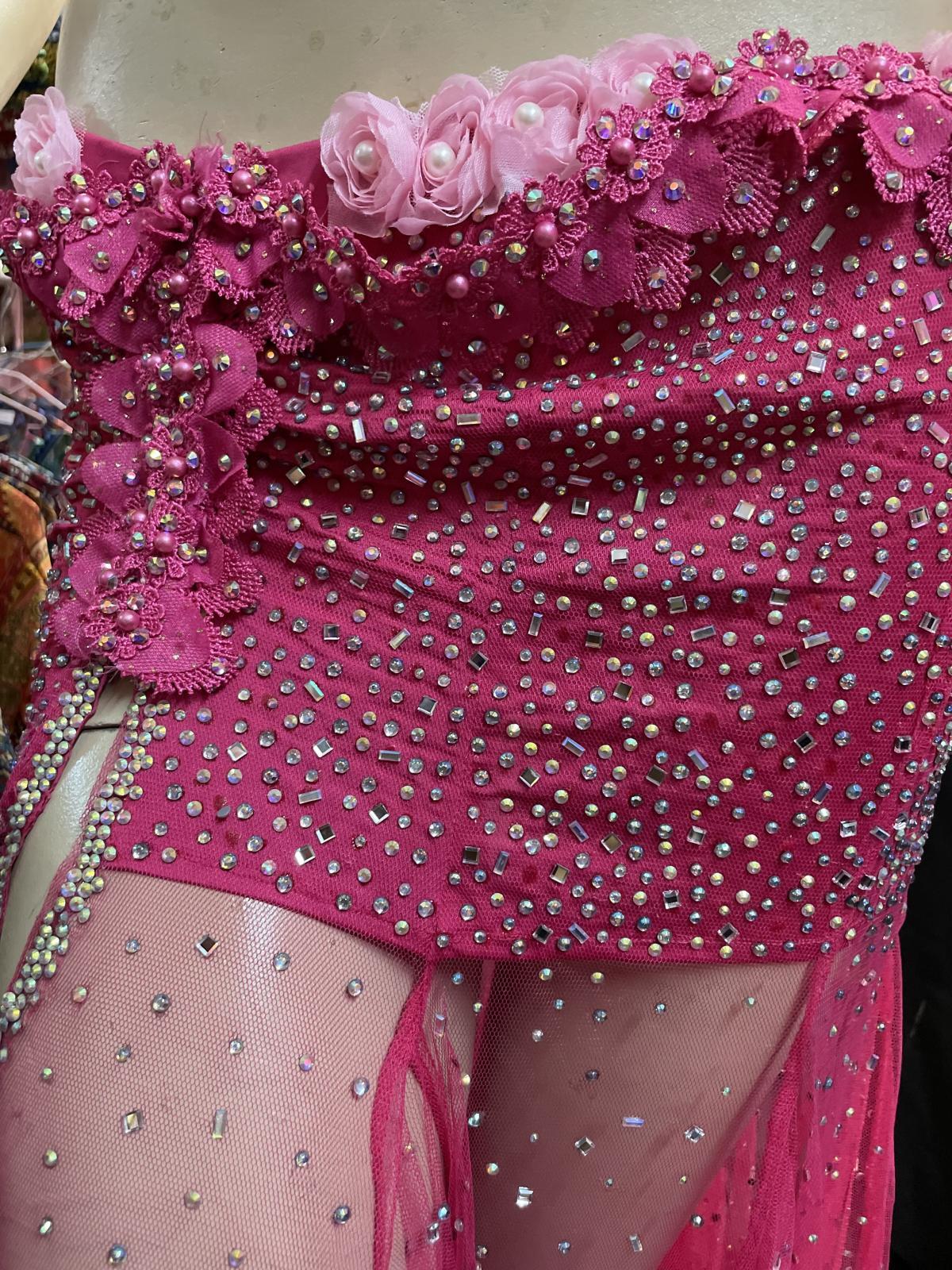 エジプト製オリエンタルコスチュームです。ローズピンクのストレッチ生地、シャーベットレッドのレース生地、