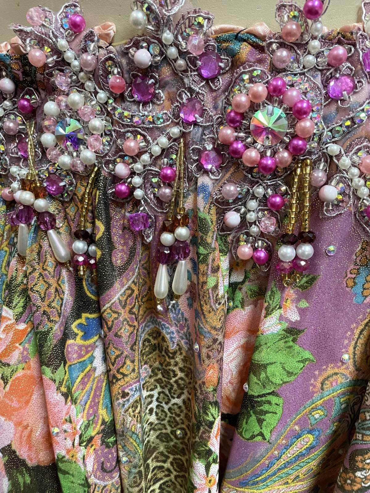ブラとスカートの腰回りには、クリスタルパーツとビーズがキラキラと輝き、