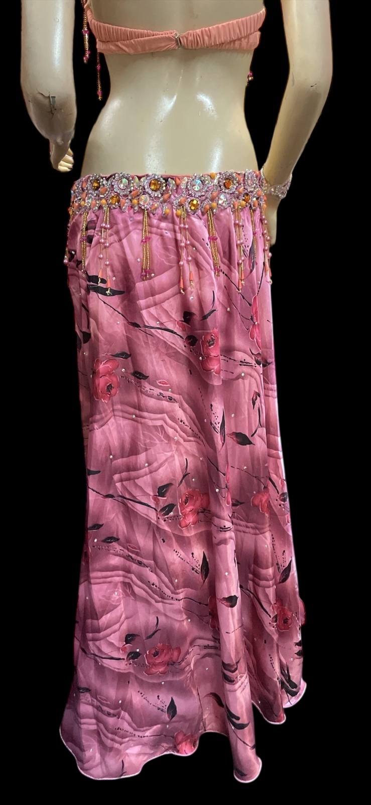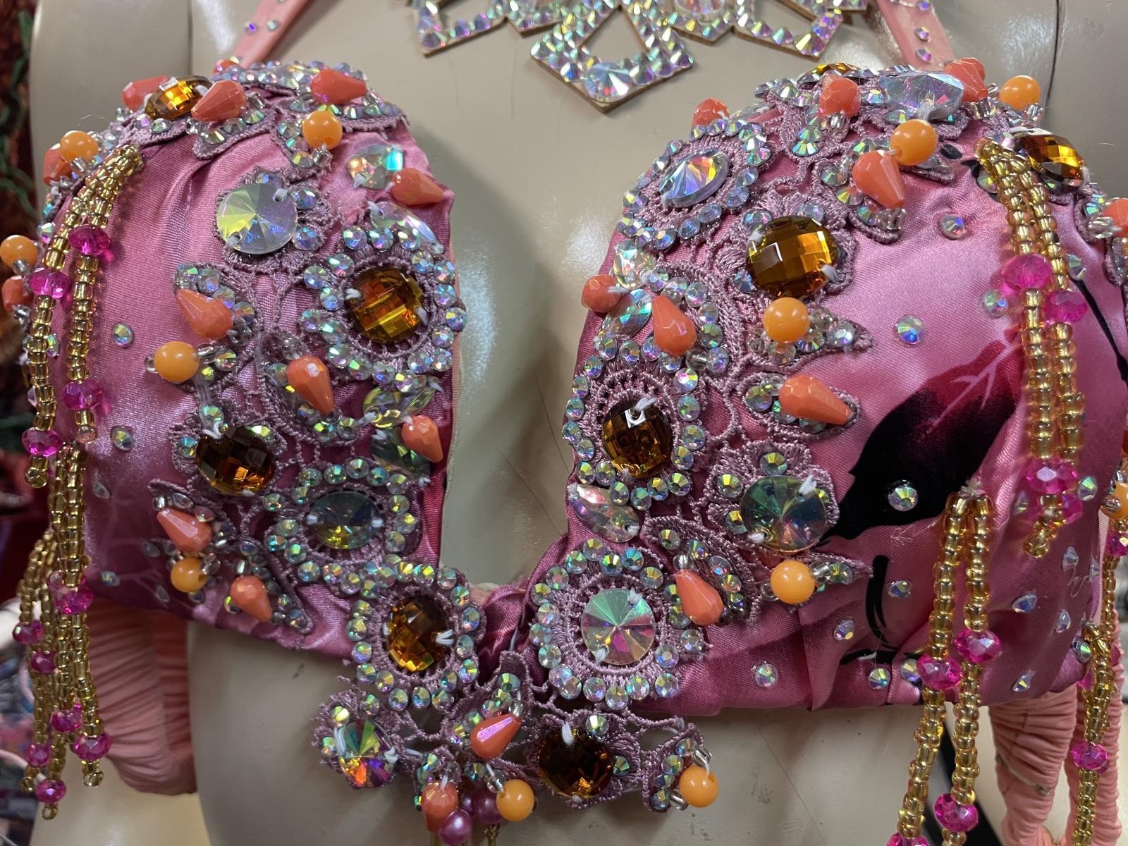 ブラとスカートの腰回りには、クリスタルパーツとビーズがキラキラと輝き、