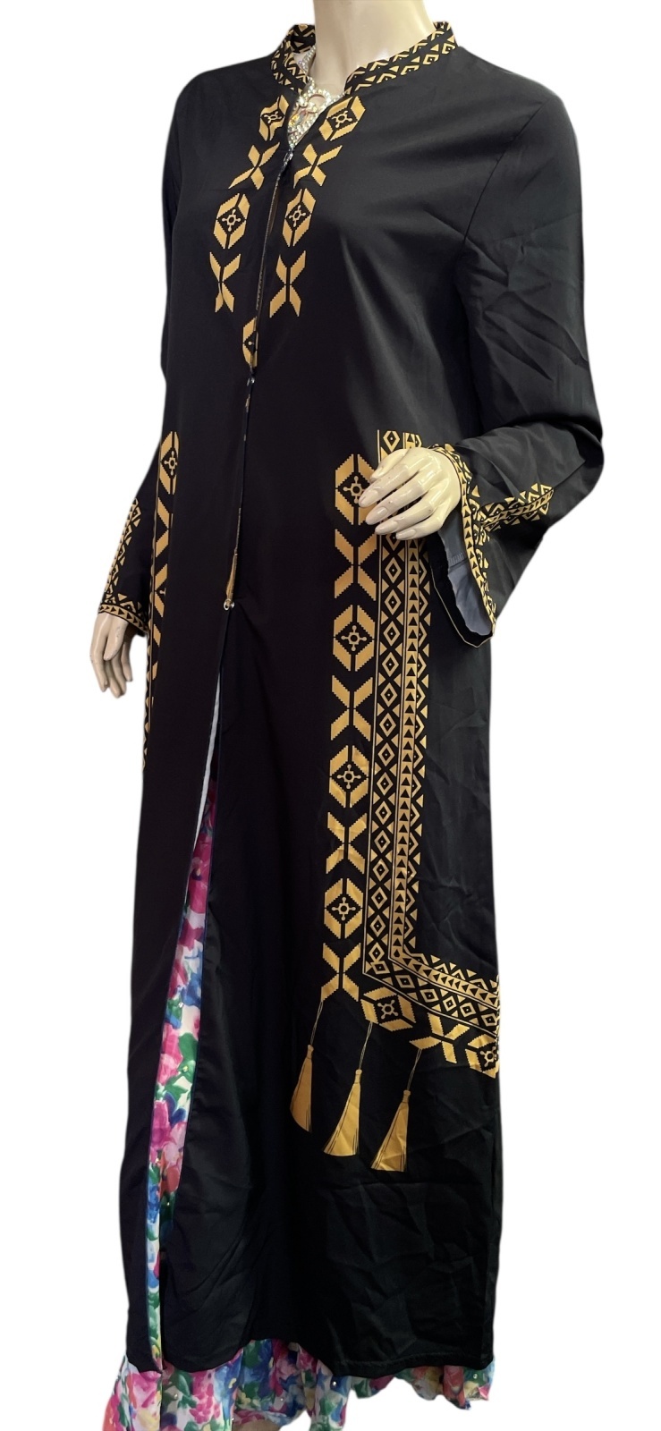 プリントポリエステルガラベーヤ☆black☆前開きタイプ☆フロントオープン
