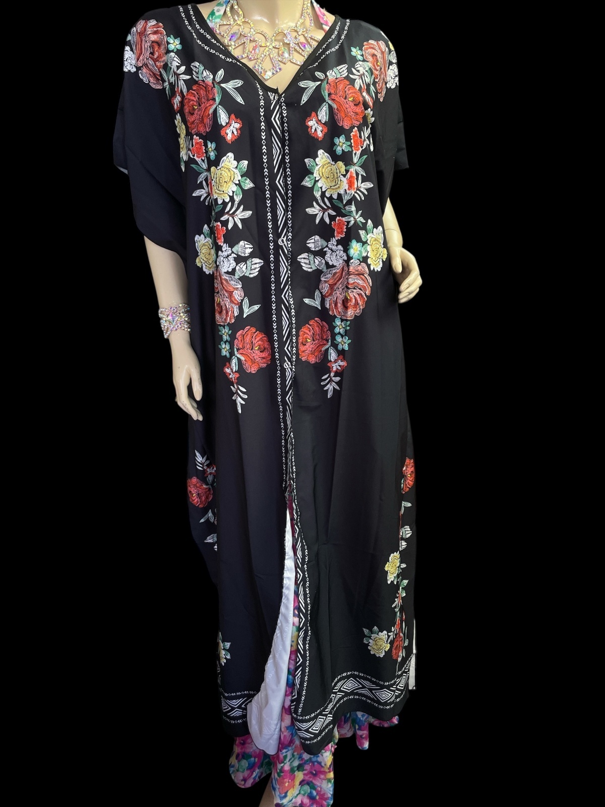 プリントポリエステルガラベーヤ☆black orange flower ☆前開きタイプ☆フロントオープン