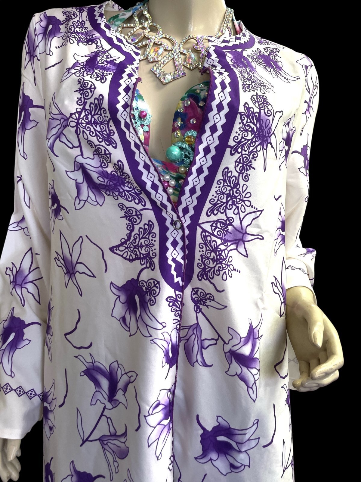 プリントポリエステルガラベーヤ☆white purple flower ☆前開きタイプ☆フロントオープン