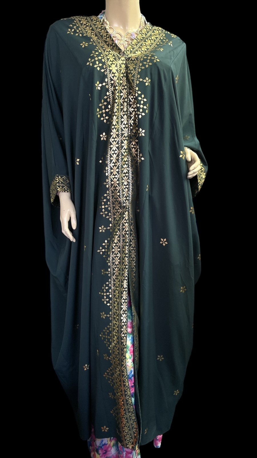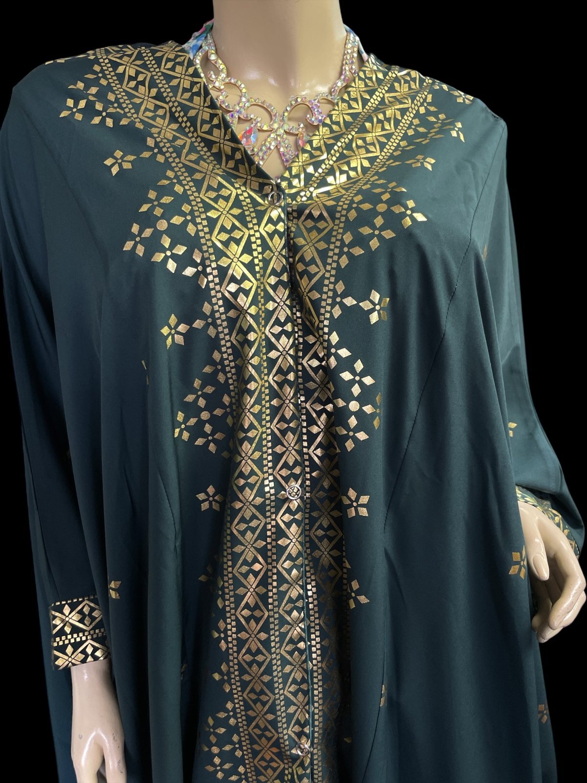プリントポリエステルガラベーヤ☆green gold print ☆前開きタイプ☆フロントオープン
