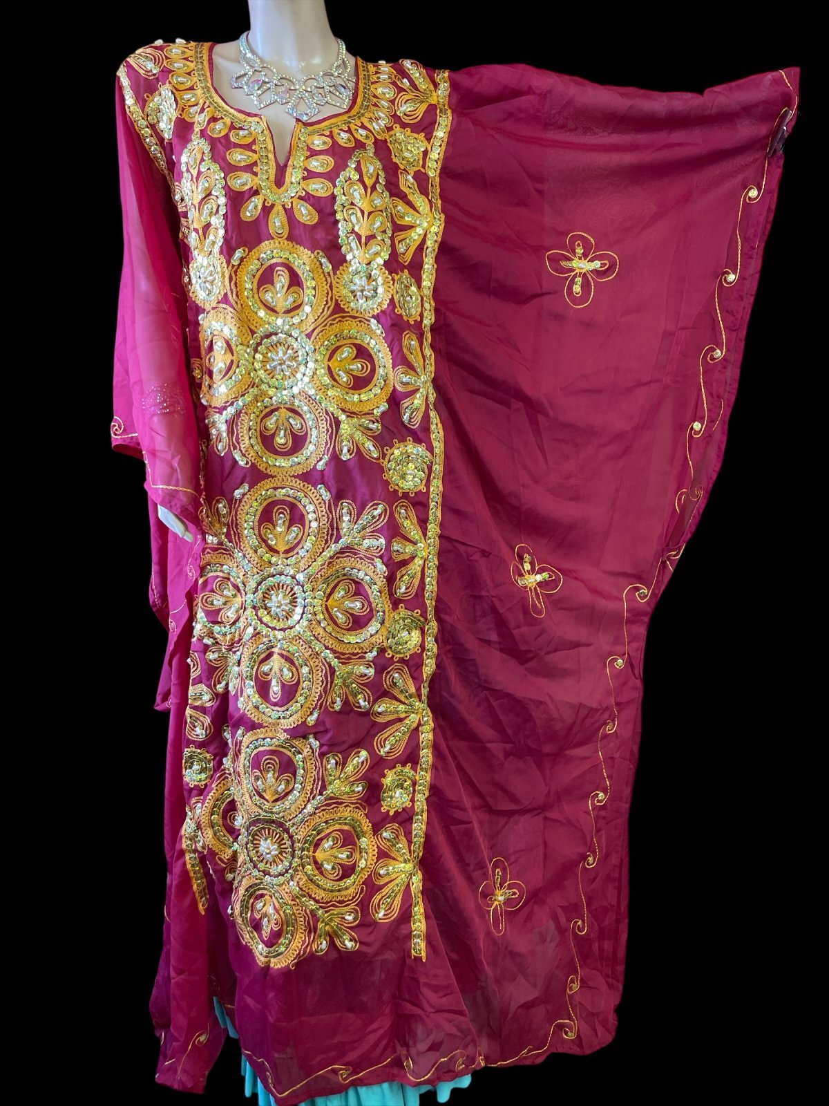 シフォン生地にスパンコール・ビーズを使って刺繍され、