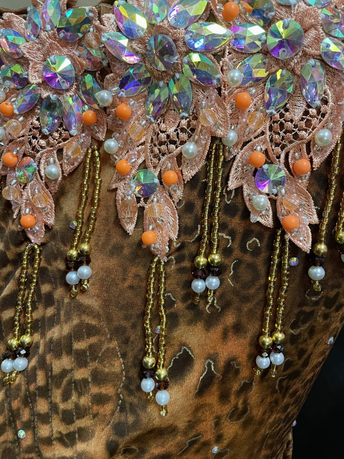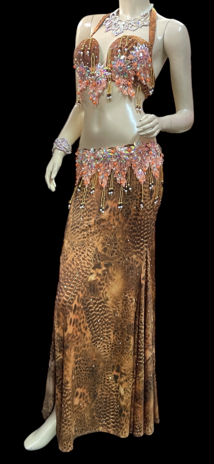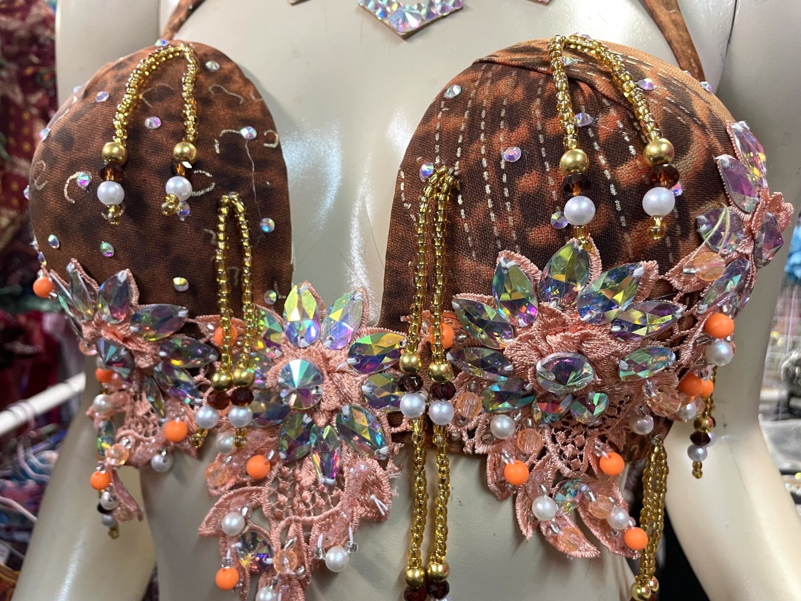 また、ブラとスカートにはビーズフリンジがあしらわれ、シミーなどの動きを美しくひき立たせてくれること間違いなし。