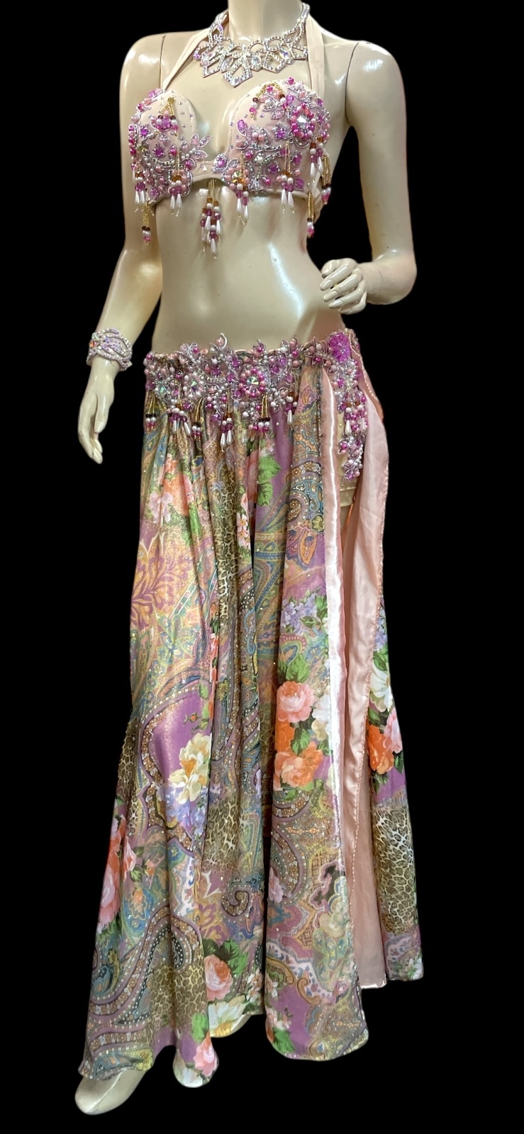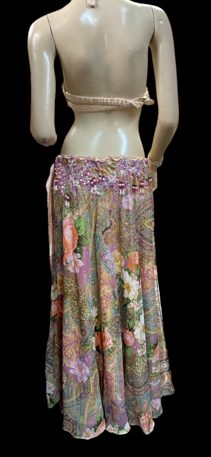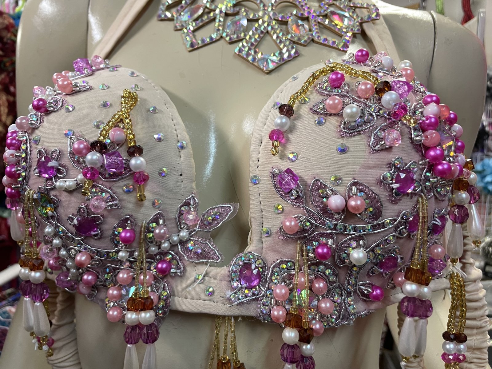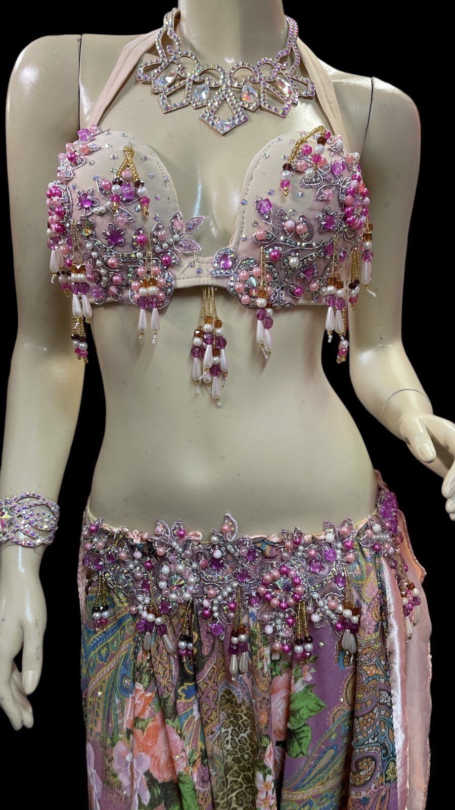 ブラとスカートの腰回りには、クリスタルパーツとビーズがキラキラと輝き、