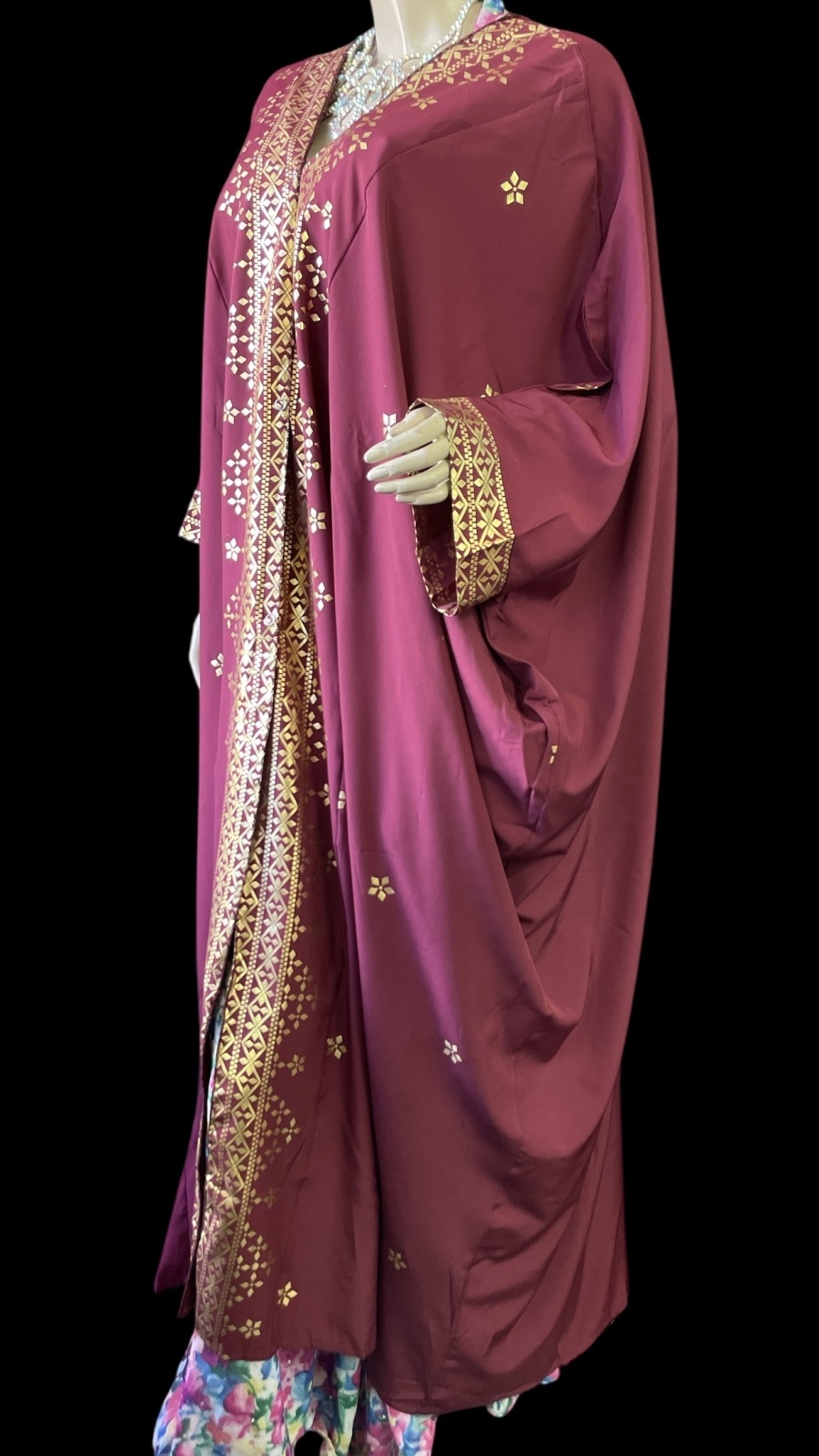 プリントポリエステルガラベーヤ☆burgundy gold print ☆前開きタイプ☆フロントオープン