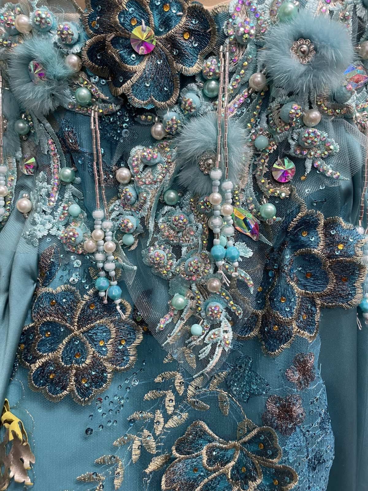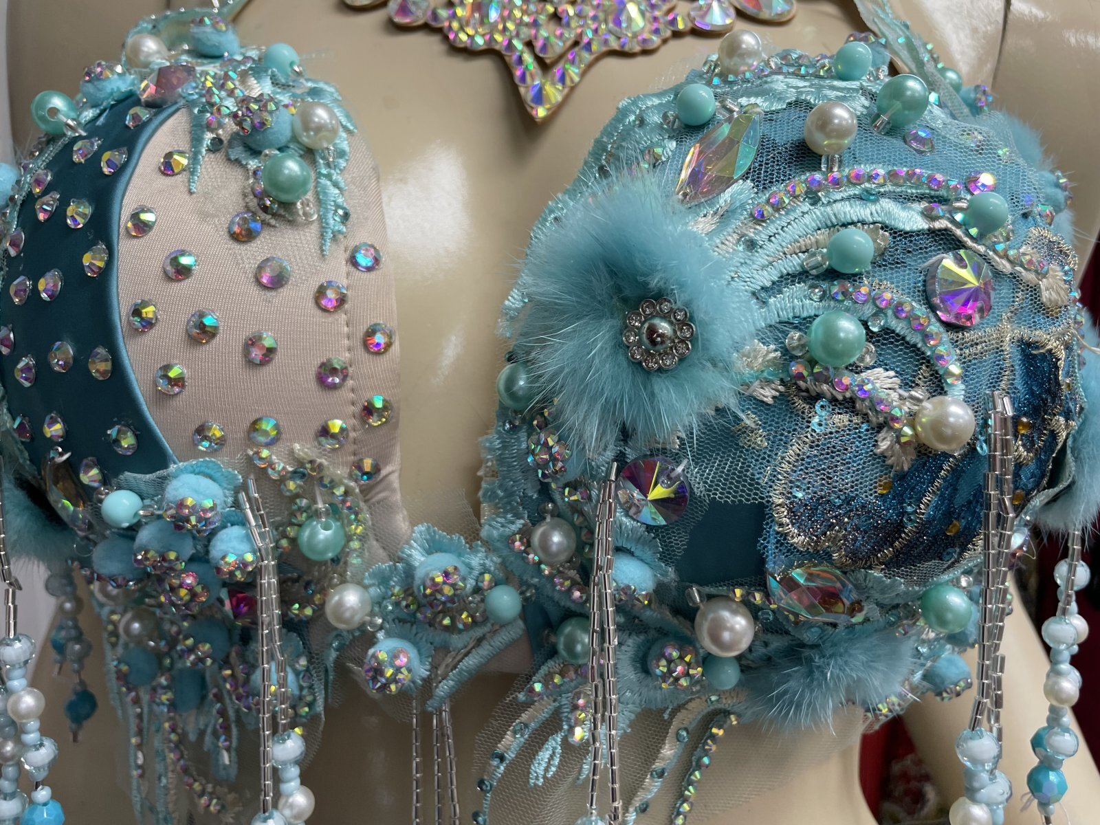 ホルターネックスタイルのブラは、ゴージャスなフラワー刺繍と揺れるビーズのフリンジがつき、デコルテを美しく見せます。